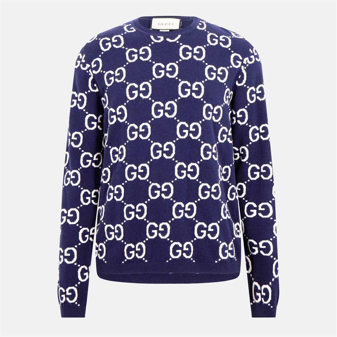 Stand out from the crowd and drape yourself in sophistication with the GG Jacquard Jumper from Gucci. Decorated in a sleek two-tone colourway, this men's sweater is perfect for everyday wear, whether at the office, relaxing at home, running errands, or meeting friends and family. Product Highlights: - Inspired by archival designs, the repeating GG pattern ensures instant brand recognition. - Ribbed trims provide freedom of movement so you can go about your day without distraction. - Composition: 100% wool. - Care: Refer to product label.