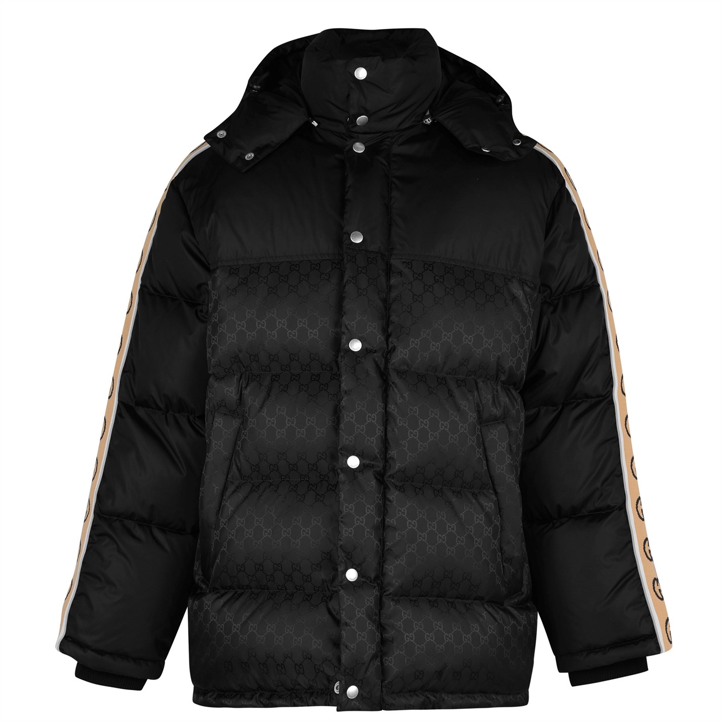 Refresh your style and upgrade your outerwear collection with this stylish GG Jacquard Nylon Padded Coat from Gucci, part of their Cruise 2020 collection. The jacket provides warmth and style in equal measure, with down goose feather padding providing protection from the cold, while the jacquard GG pattern and interlocking GG taping down the sleeve offering a modern and decadent look. Also featured is a removable thick padded hood, a two-way zip-through fastening, a snap-button sealed storm placket and ribbed inner cuffs, ensuring you are best protected from the elements and the warmth stays inside.Men's padded jacket from GucciLong sleevesRemovable hoodTwo-way zipperSnap-button fasteningsRibbed cuffsJacquard and tape designNylon liningAdjustable waist drawstringFront zip pocketsInterior zip pocket100% polyamideDown goose feather paddingDo not wash