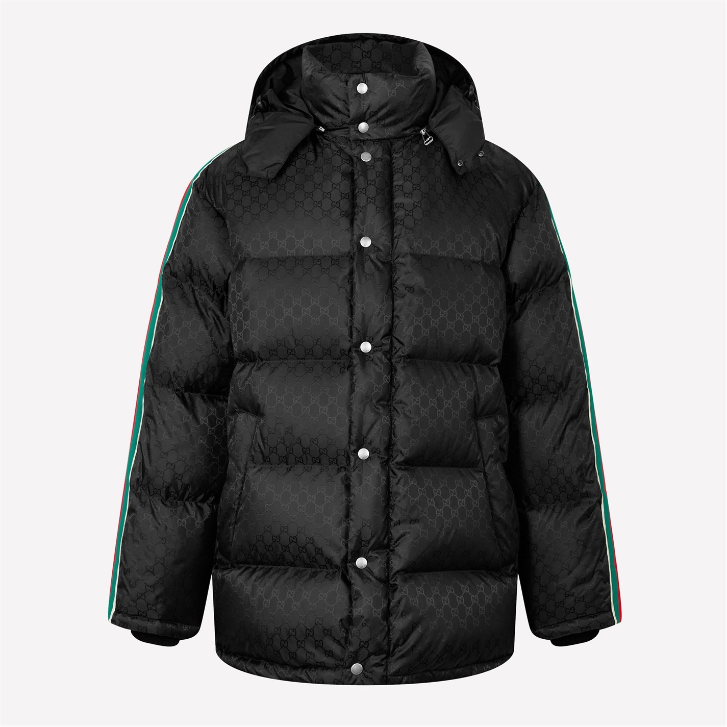 Face the cold in style with the Gucci GG Nylon Jacquard Web Jacket, a seamless blend of classic house codes with contemporary styling. Adorned with an all-over GG jacquard pattern, this puffer coat ensures instant house recognition, while the indulgent goose-down filling provides luxurious warmth, keeping you cosy as you navigate the city or head out to meet friends. Product Highlights: - Iconic green and red web detailing down the sleeves pays homage to Gucci's rich heritage and luxury exclusivity. - Elastic toggle and ribbed cuffs ensures cold breezes and rain at kept at bay. - Composition: Outer: 100% polyamide. Filling: duck feather, goose down. - Care: follow care instructions.