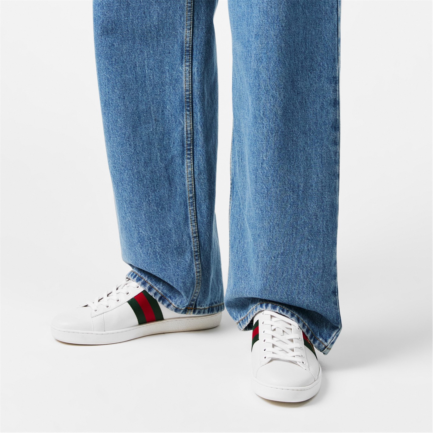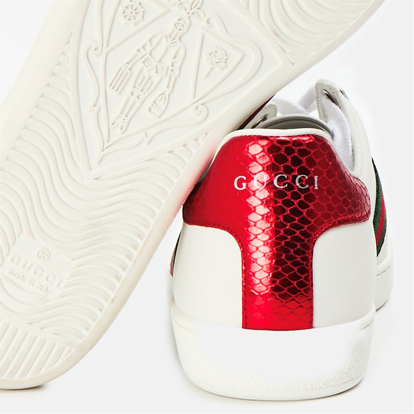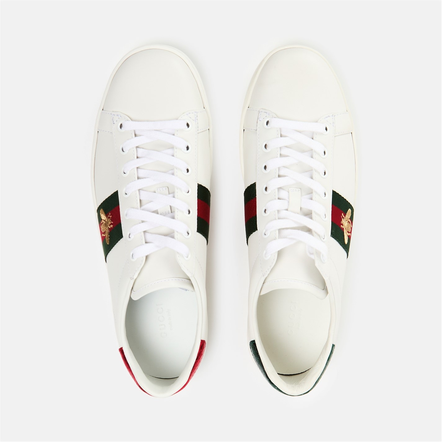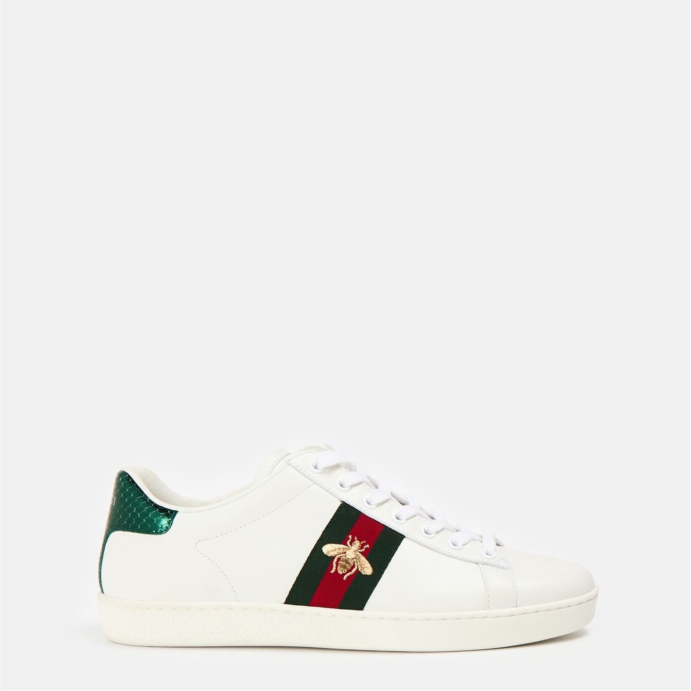 Gucci's iconic Ace Bee Sneakers offer a luxurious reinvention of a classic white profile. These stylish women's low-top trainers blend timeless design with contemporary details, perfectly complementing casual, everyday looks. Whether heading to the office, meeting friends for cocktails, or exploring a new city, these versatile shoes deliver both elegance and comfort. Product Highlights: - Premium leather throughout, from the upper to the lining, finished with a durable rubber sole for lasting wear - Signature Gucci Green and Red Web stripes adorn the sides, while the iconic bee embroidery adds a distinctive touch - Iridescent leather heel counters showcase the house's signature lettering, ensuring instant brand recognition - Care instructions: Maintain the pristine appearance by cleaning with a soft, dry cloth or brush only
